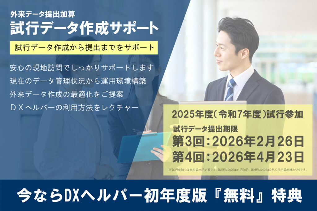 外来データ提出加算を算定するには、試行参加にてデータ作成の実績を認めてもらう必要があります。作成するデータのなかでも一番の難関は「外来様式1」です。現在の院内のデータ管理状況を伺い、貴院に最適な運用方法をご提案いたします。DXヘルパーを使って試行データ作成から提出までをしっかりサポートいたします。